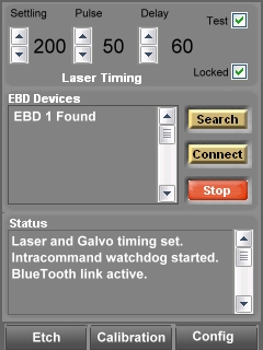 Solution: To meet these requirements we developed both a Windows Mobile 5.0 application running on a HP iPaq and an embedded system module. The multi-threaded Windows application features a series of easy to use custom tabbed dialogs for laser control, marker editing and system configuration. The application communicates via a BlueTooth link to a custom embedded system utilizing a Silicon Lab's microprocessor for lower-level laser and galvanometer control. Video can also be sent back from a camera mounted on the microscope for visual feedback. |