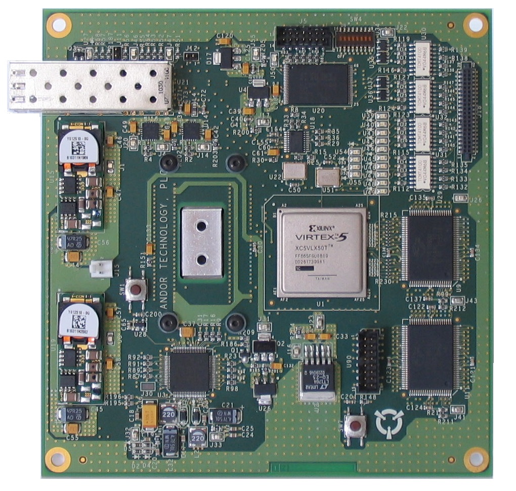 ![]() The flip-view of the optics-head pc board shows the SFP multi-gigabit interface, the Virtex-5 gate array, RAM, the rear of the DMD (Digital Micromirror Device) and a variety of support logic. The design supports up to a 1920x1080 array of mirrors. The Virtex-5 implements the very substantial DMD interface and timing logic, multi-gigabit packet decode and assembly logic, SRAM image frame logic, a custom 32-bit microprocessor taylored to DMD image operations, and complex multi-port memory logic, FIFOs and multi-ported internal memories. |