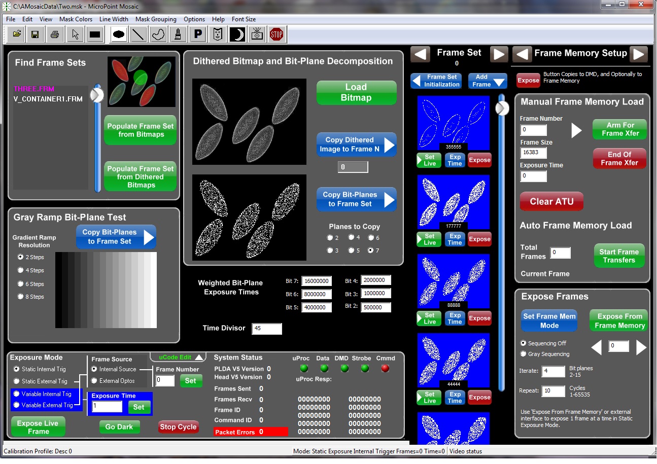 ![]() The Mosaic application gives the user control over various operating modes, selection of cells of interest, editing of image masks, loading of image memory buffers, a microcode assembler for the custom 32-bit microprocessor, and access to a variety of status, timing and control parameters. |